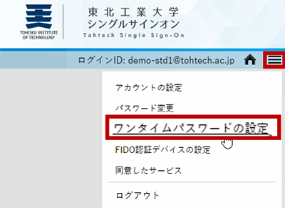 右上の「三」アイコン → 「ワンタイムパスワードの設定」を選択します。